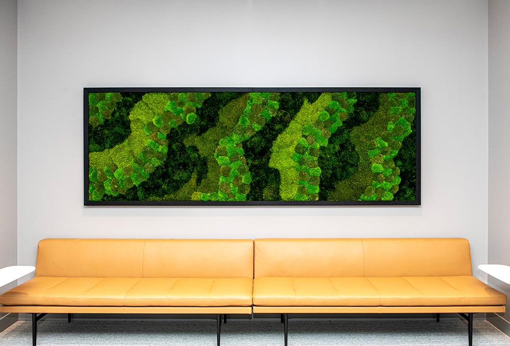 Bringing natural elements indoors, preserved moss feeds off micronutrients in the air and doesn’t require watering. The moss is dyed to adapt to patterns that complement the design of the space it is created for. It offers a unique and contemporary aesthetic, with biophilic properties that take into account the acoustic considerations of designing a space, such as speech intelligibility, noise control and reverberation.